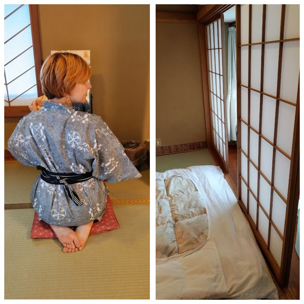 Здесь мы остановились в традиционной японской гостинице рёкан, которая работает с 1910 года. Спали на футонах, ели сидя на полу, облачившись в юкаты. Максимально погрузились в культуру.