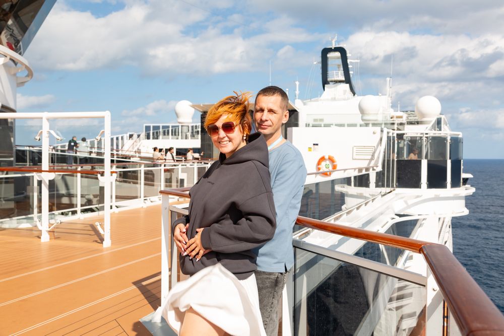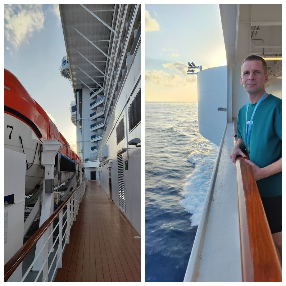 Облазили просто весь лайнер, заглянули в каждый уголок, Даже туда, куда обычно не заглядывают туристы. Например гуляли по палубе, где корабельный персонал курит или просто наслаждается видом. Мы тоже там прогулялись, понаслаждались. Красиво, классно.