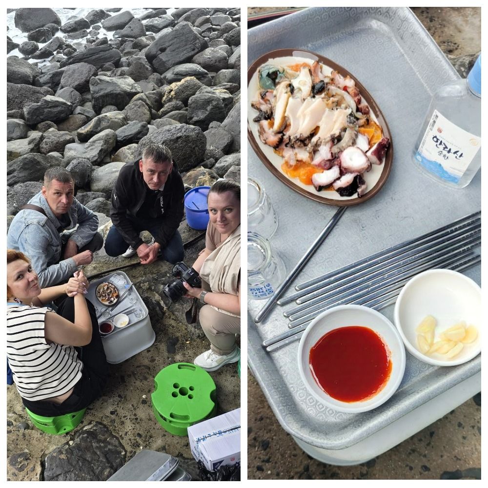 Попробовали местную водку соджу и свежайших, ещё трепещущих морегадов.