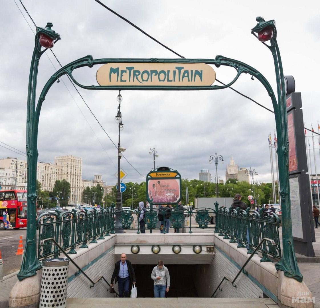 ▫️Вход в метро «Киевская» (№3) — точная копия парижского метрополитена ХХ века. Проект французского архитектора Эктора Гимара был реализован в 2007 году. В 2022-м вход отремонтировали, но там по-прежнему сохранилась желтая табличка с надписью Mеtropolitain.