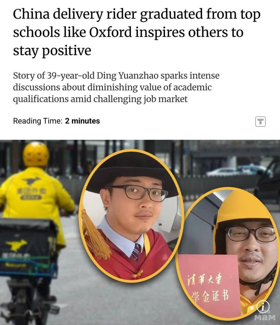 Один Китаец, окончивший 4 престижных универа, включая Оксфорд, сейчас работает курьером и зарабатывает $550 в неделю. Как вам такое? За 15 лет он получил четыре высших образования и одну докторскую степень, обучаясь в ведущих вузах Китая, Сингапура и Великобритании.
