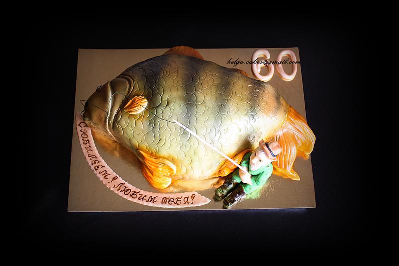 Вот такого окуня поймал юбиляр! Начинка шоколадный бисквит со сливночно-сметанным кремом и вишней.