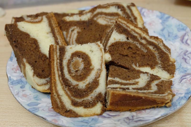 Тесто разделить на 2 равные части, в одну добавить какао. Чашу мультиварки смазать маслом и выкладываем тесто ровно по центру по 2 ст. ложки, далее чередуя.