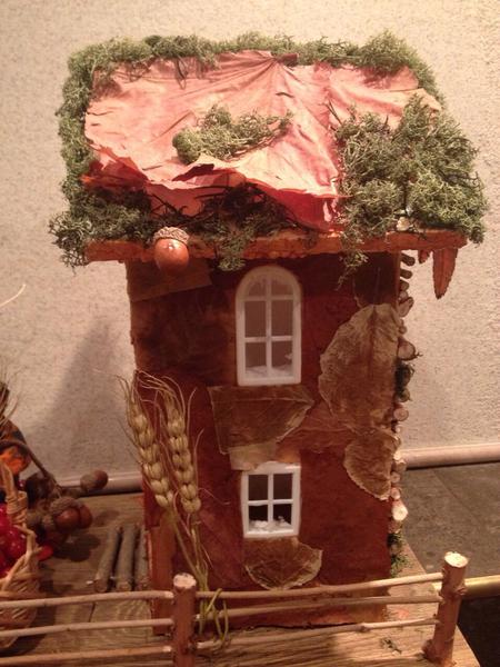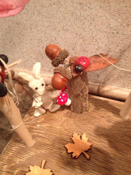 Хочу показать поделку, которую мы с детьми сделали год назад, в октябре 2015 года. Домик вырезан из пенопласта и обклеен сухими листьями, ветками и натуральным мхом. В корзине у медведя калина. Колосья и жёлуди искусственные. А медведь веселый-разноцветный, поскольку задумали мы его в последний момент и пластилина не хватало. Пришлось смешать все цвета из коробочки).