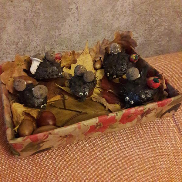 Не прям вот красота, я ее про себя назвала "ежастики" ))) Но делали честно вместе с сыном, не люблю я сугубо "родительские произведения". Мы с сыном не особо в этом плане творчески натуры ))) сын сам красил кожуру от каштанов и делал грибочки из пластилина и шляпок желудя, глазки и носики я и еще яблочки ))) коробочку обклеили оберточной бумагой и все красиво уложили и закрепили.