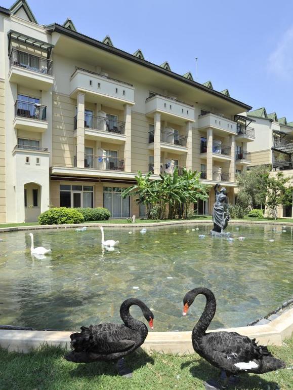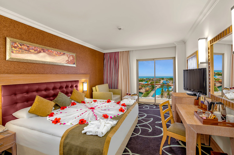 Инфраструктура - Отель имеет собственный песчаный пляж длиной 180 метров. 5 открытых бассейнов (2580, 560, 600, 160 и 380 кв.м) и 2 крытых бассейна (250 и 200 кв.м), 7 водных горок, амфитеатр, кинотеатр, ТВ-зал, живая музыка, дискотека (бесплатно), ночной клуб (бесплатно), библиотека, обмен валюты, Wi-Fi (на территорри отеля, бесплатно), сейф на ресепшн (бесплатно), дискотека. - Зеленая территория, пруды и лебеди, все для вашего взора и времяпровождения. - А также к услугам гостей: турецкая баня, сауна, джакузи, фитнес-центр, СПА, тренажерный зал, большой теннис, анимация, аэробика, аква-аэробика, теннисные ракетки и мячи, дартс, бочча, мини-футбол, пляжные волейбол и футбол, баскетбол, мини-гольф, стрельба из лука, настольный теннис, водные лыжи, каноэ.