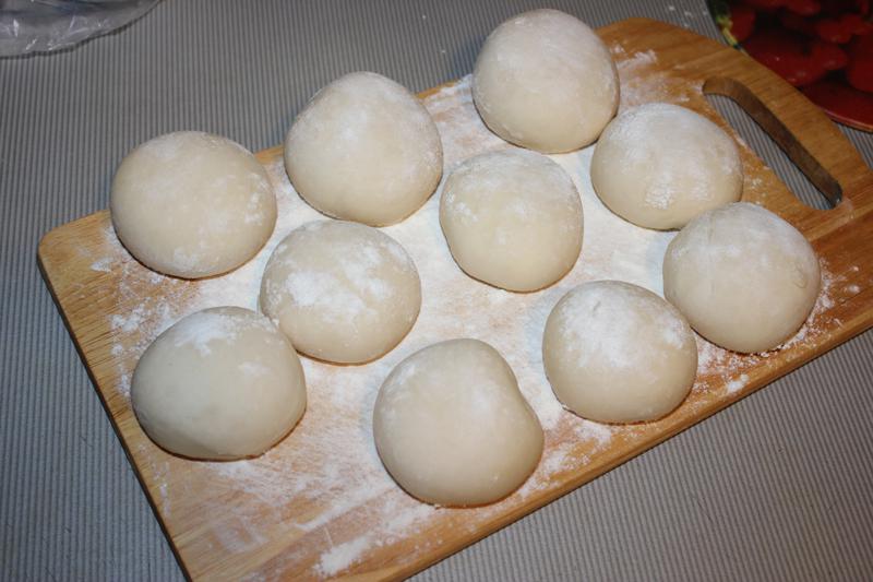 Разделочную доску присыпать мукой,выложить тесто,присыпав его сверху мукой.Накрыть полотенцем.Оставить размораживаться.За это время тесто подымется.