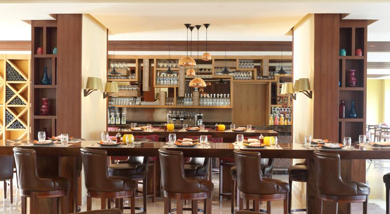 - The Veranda (отрытый ресторан с видом на пруд предлагает лёгкие закуски и блюда итальянской и индийской кухонь в течение дня (с 11:00 до 23:00)