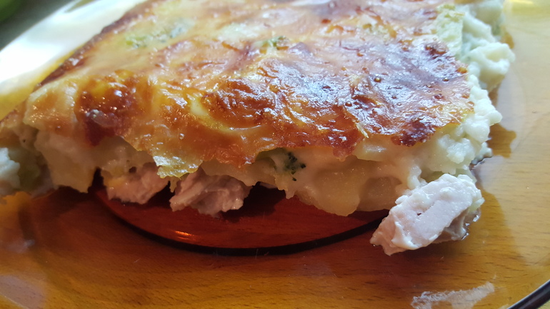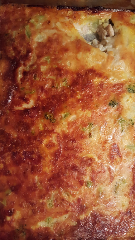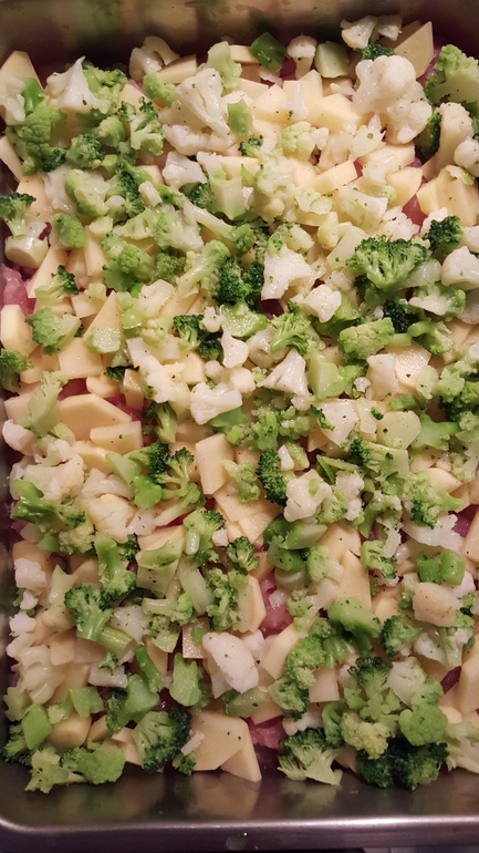 Соуса бешамель готового дома не оказалось... поэтому сделала его сама. 100 гр. сливочного масла, 100 гр. муки и около 1л молока. Залила им уже выложенные на лист брокколи, картошку и мясо
