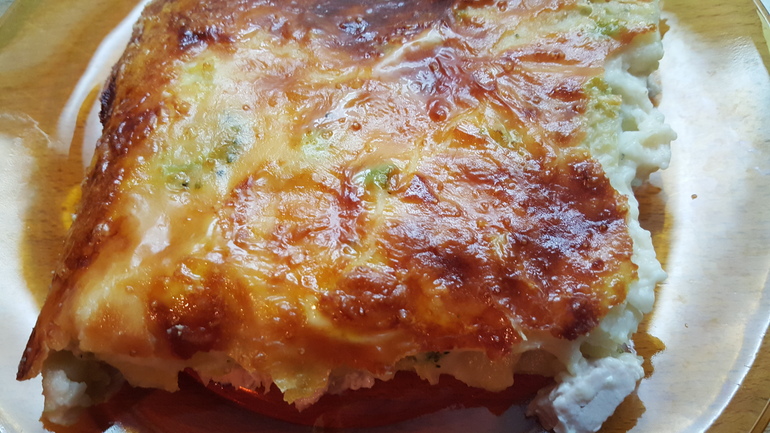 Соуса бешамель готового дома не оказалось... поэтому сделала его сама. 100 гр. сливочного масла, 100 гр. муки и около 1л молока. Залила им уже выложенные на лист брокколи, картошку и мясо