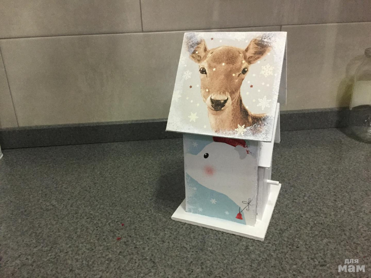 В саду попросили принести либо кормушку для птиц,либо скворечник ☺️ Мы не стали сильно заморачиваться и купили заготовку из которой сделали декупаж,вышло кривовато,но сами и впервые)))) уж очень хотели Снегирей ну🤔или хотябы Синичек на наш скворечник,но в поисках обошли практически весь город вышли звери😂