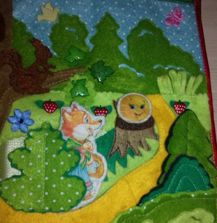 Колобок укатился и встретил всех героев сказки на другой страничке в лесу