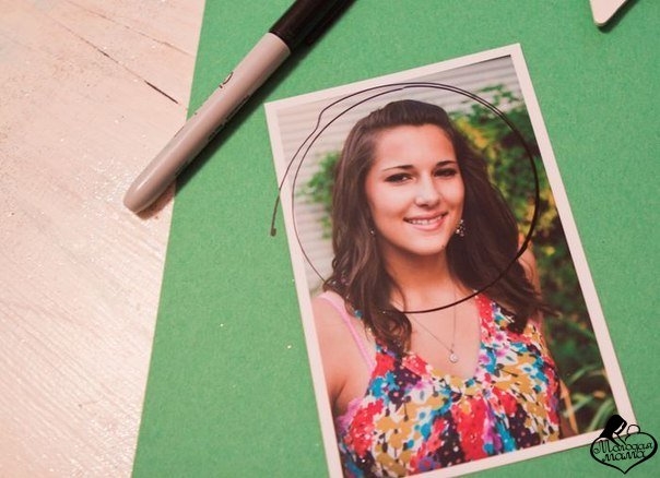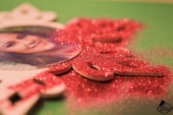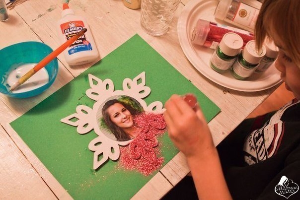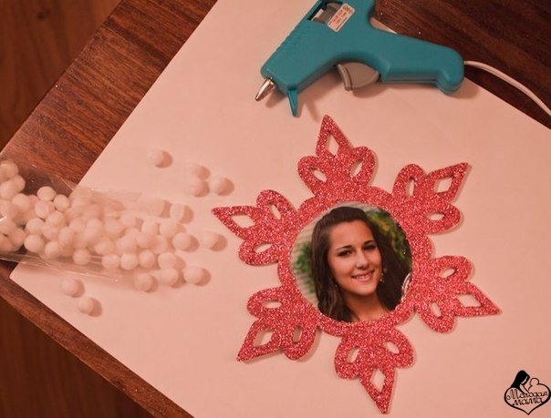 1. Вырежьте лица из фотографий, наклейте их в центр снежинок, присыпьте блеском, украсьте мишурой, помпонами, тесьмой.