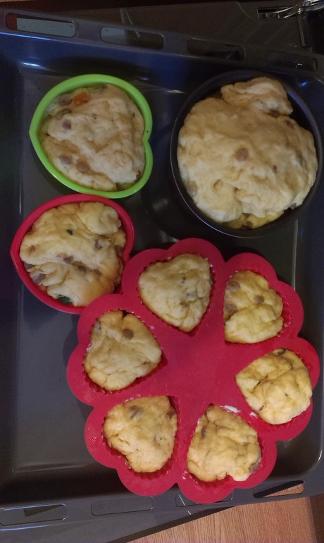 Теперь разделите тесто на 2 кулича, разложите в формы, засыпьте изюм и цукаты и дайте подняться на 2/3 формы.