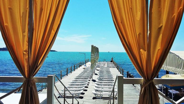шезлонги предоставляются бесплатно! Пляж - деревянный настил