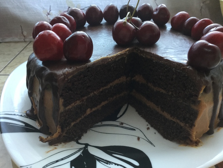 Пекла этот торт второй раз. Решила печь в мультиварке. Выпекание заняло 1.5 ч на режиме Выпечка. После остывания коржа убрала его в холодильник в пищевой пленке до утра. А утром разрезала на 3 коржа и промазала кремом (вареная сгущёнка+масло). Сверху ганаш из горького шоколада (шоколад, сливки, сливочное масло). Вкусно, но для меня тяжеловат крем, и очень сладко все же. А в первый раз выпекала в духовке по отдельности 3 коржа, показалось неудобно, выпекание одного коржа занимает 40-50 мин, а тут в 3 раза дольше. Каждый корж получился с бугорком сверху, который нужно срезать, соответственно торт уменьшается. Зато крем был очень удачный- взбитые сливки+творожный сыр. Он хорошо пропитал и так достаточно влажный торт и оттенил его сладкий вкус. Сверху ганаш из молочного шоколада. В общем, подводя итог, печь этот торт буду и дальше, в мультиварке, крем нужен легкий (комбинация - сливки, творог, творожный сыр, сметана). Ганаш вкуснее с молочным шоколадом.