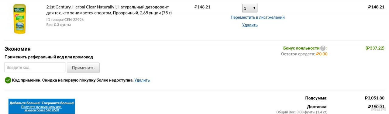 Например, если покупатель заказывает тяжелые по весу товары (такие как протеин, большие емкости с жидкостью и т.д.), скорее всего, при совершении покупки будет необходимо оплатить расходы по доставке. На менее тяжелые по весу товары (добавки, товары для душа и красоты и т.д.) стоимость доставки может быть очень низкой и даже бесплатной. Тем не менее, бесплатная доставка не гарантируется, как это было ранее.