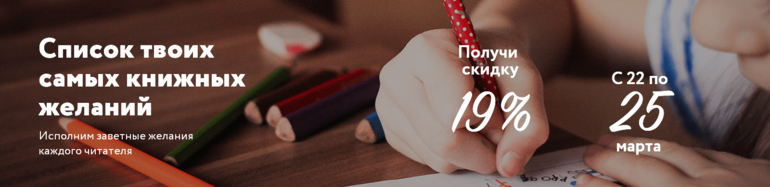 Мы открыли весенний список желаний. Добавляйте любимые книги, а затем, с 22 по 25 марта, покупайте с дополнительной скидкой 19%.С 02.03.2017 по 25.03.2017