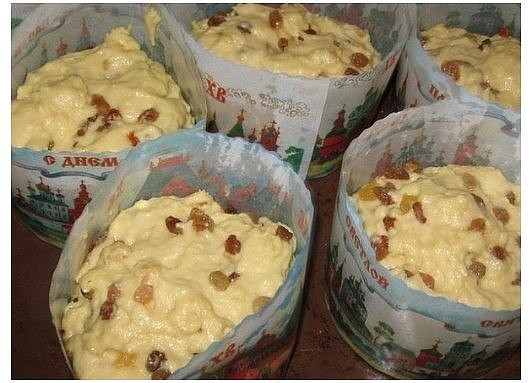 Тесто выросло. Выкладывать тесто в смазанные выстеленные кулинарной бумагой формочки на 1\3 высоты. Поставить в теплое место до того момента, пока тесто не вырастет на всю высоту (примерно 45 минут). Смазать пасхи сверху желтком, растворенным несколькими каплями холодной воды.