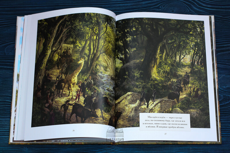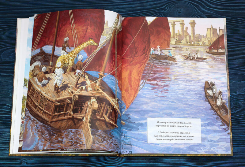 Детский писатель Ян Валь и художник Лоран Гапайяр рассказали эту историю от имени самой жирафы. Пышная зелень саванны, бездонное голубое небо сменяются картинами ловли жирафы, бушующего синего моря, диковинных сооружений, всплывающих на горизонте, яркими красотами незнакомой природы. Великолепные, панорамные, реалистичные иллюстрации погружают захватывают, заставляют забыть о том, что окружает тебя в действительности.