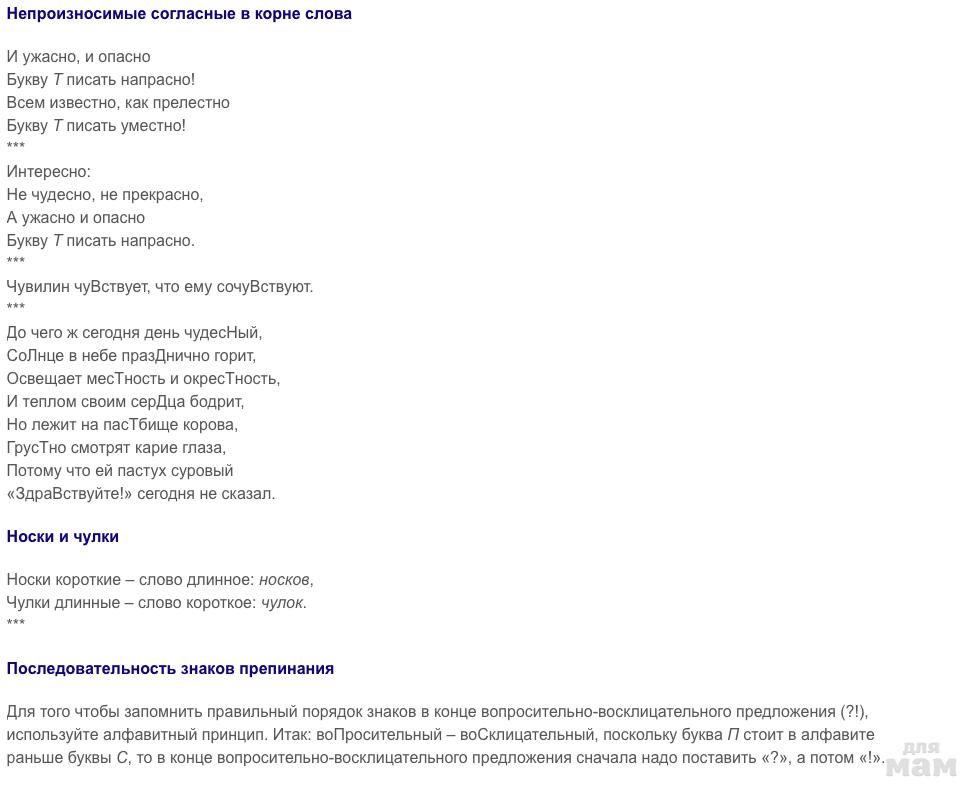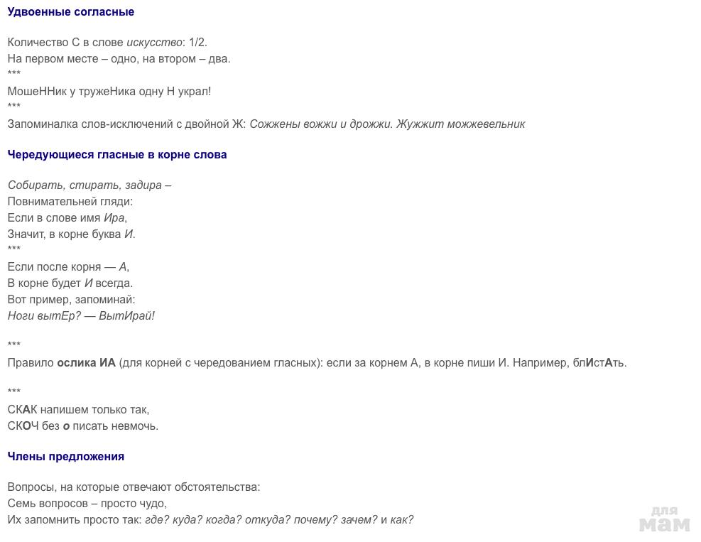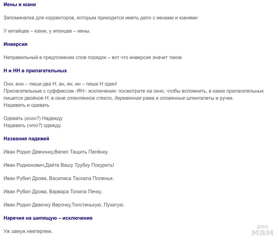 КОРОТКИЕ МНЕМОНИЧЕСКИЕ ФРАЗЫ ДЛЯ ЗАПОМИНАНИЯ ПРАВИЛ РУССКОГО ЯЗЫКА