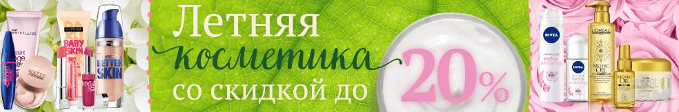 Летняя косметика со скидками до 20%на декоративную и ухаживающую косметику, аксессуары для красоты и здоровья от профессиональных экспертов в этой области L'Oreal Paris, Maybelline, Garnier, Organic Shop и Dewal действуют скидки до 20%.