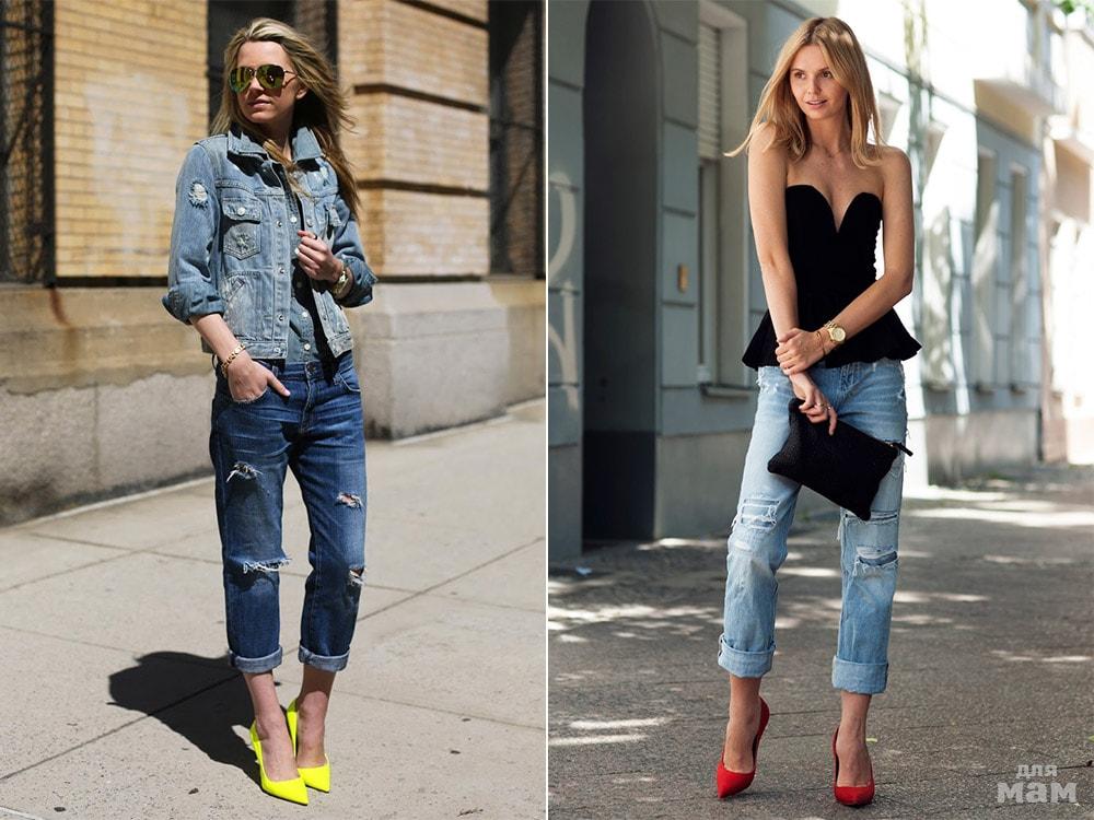 Как правильно носить бойфренды Общие правила весьма просты: для деловых образов выбирай модели классического синего цвета без потертостей и прорезей; широкие подвороты визуально укорачивают ноги – не рискуй, если твой рост ниже 160 см, или хотя бы одевай обувь на каблуке; чтобы не выглядеть уж совсем «пацанкой», разбавляй образ женственным верхом или остроносыми туфлями-лодочками; подбирай массивную бижутерию или крупные серебряные украшения. Изящное золото теряется на фоне объемных брюк; ответственно относись не только к выбору обуви и верха, но и аксессуаров: подобранные по стилю сумка и очки еще никогда не были лишними; бойфренды намного интереснее смотрятся с ремнем – тонкий и яркий можно обыграть в качестве акцента, а широкий лишь добавит образу выразительности. С какой обувью сочетаются джинсы бойфренды С любой. Причем независимо от наличия/отсутствия каблука, ширины носка или цвета. Суть в том, чтобы эта самая обувь вписывалась в образ, подходила по стилю к конкретной модели бойфрендов и была адекватна времени года. А остальное – на твой вкус. Джинсы бойфренды с лодочками и туфлями Классический вариант – сочетание джинсов бойфрендов и лодочками на шпильке. Причем здесь возможны варианты: в зависимости от назначения лука подбирай соответствующую высоту каблука и цвет обуви.