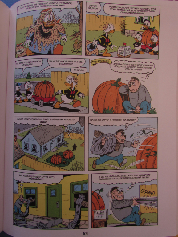 О книге: твердый переплет. Матовая, частично-лакированная обложка. 208 плотных страниц, на которых разместились тринадцать историй о приключениях Дядюшки Скруджа.