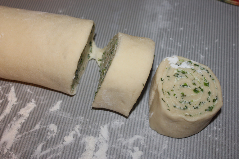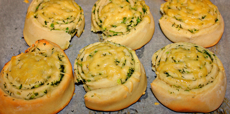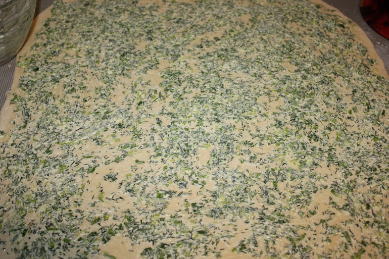 Тесто готовим как на булочки с корицей по этому рецепту Для начинки мелко нарежем укроп и зеленый лук.Чеснок пропустить через пресс.Затем все перемешать со сливочным маслом.В отличии от булочек с корицей,в этом рецепте мы масло не растапливаем,а даем растаять при комнатной температуре.Оно должно быть мягким,а не жидким!!!