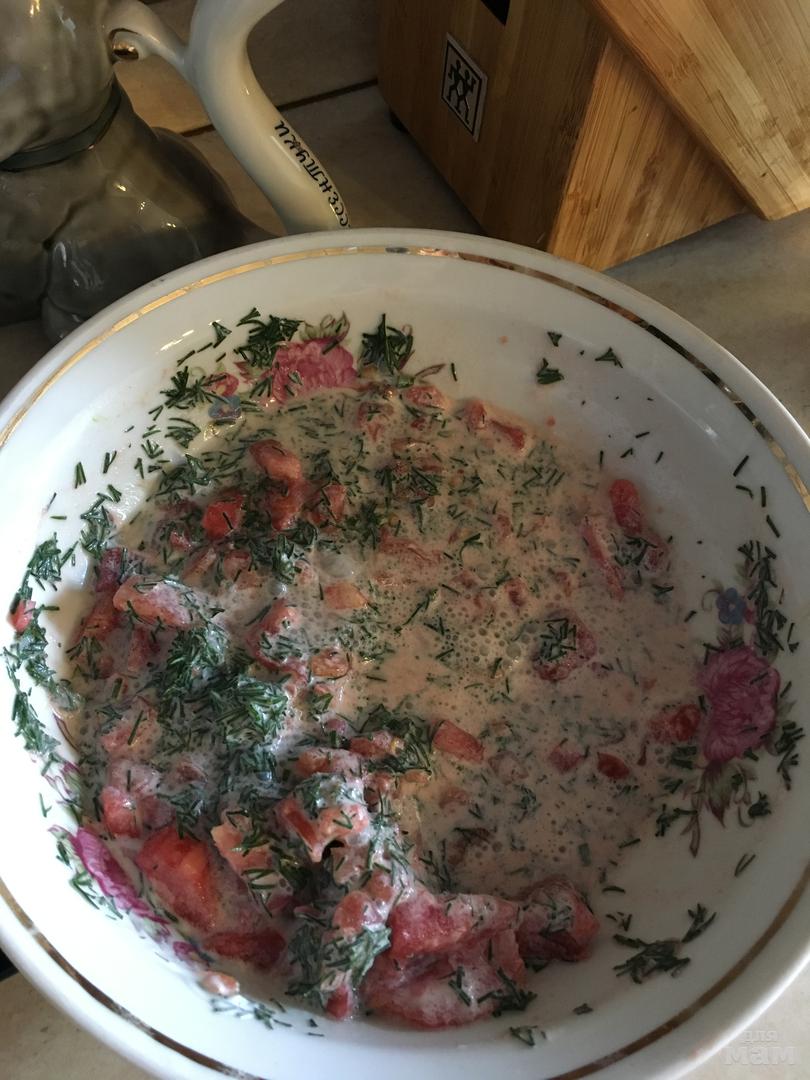 зелень, помидоры, немного сметаны (наверно, можно и сыр тоже)