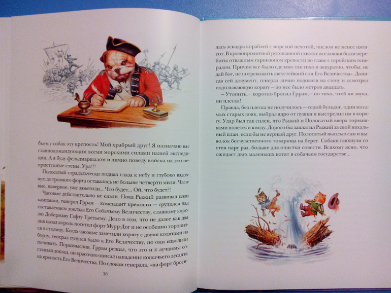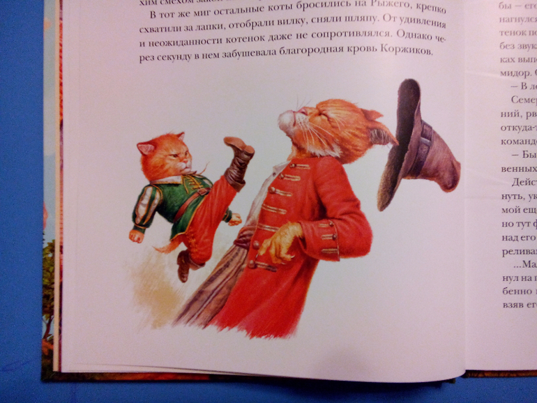 Но если воспитанием Рыжего занимались гувернантки и приглашенные учителя, то за воспитание Полосатого взялся сам адмирал. Полосатый спал в гамаке, гулял в любую погоду, лихо расправлялся с рыбой, пел пиратские песни, мог перечислить достоинства любого судна и неплохо владел основами английского бокса. Это был крепкий, практичный котенок, готовый к любым ударам судьбы и сам умеющий наносить ей удары.