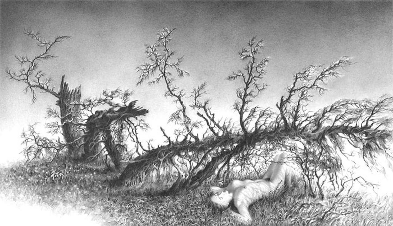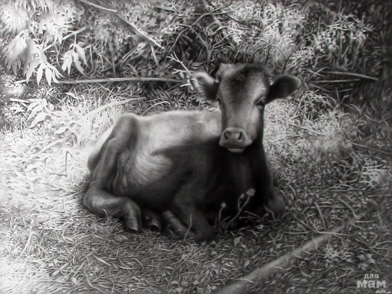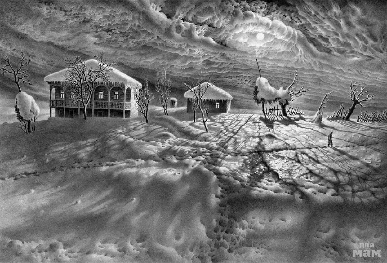 Пишет на бумаге большого формата почти не видными глазу штрихами графитного карандаша.