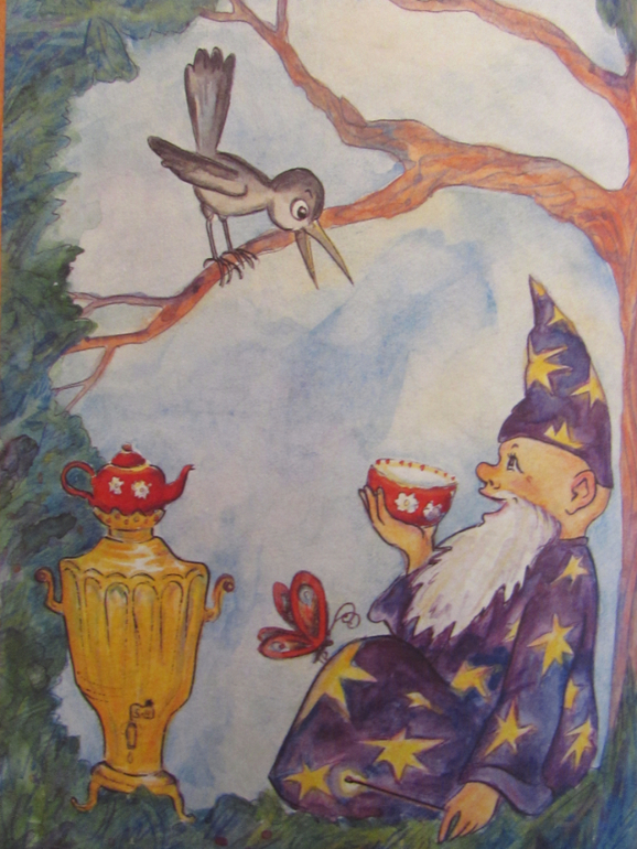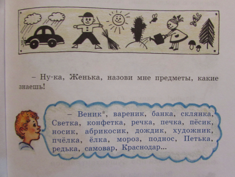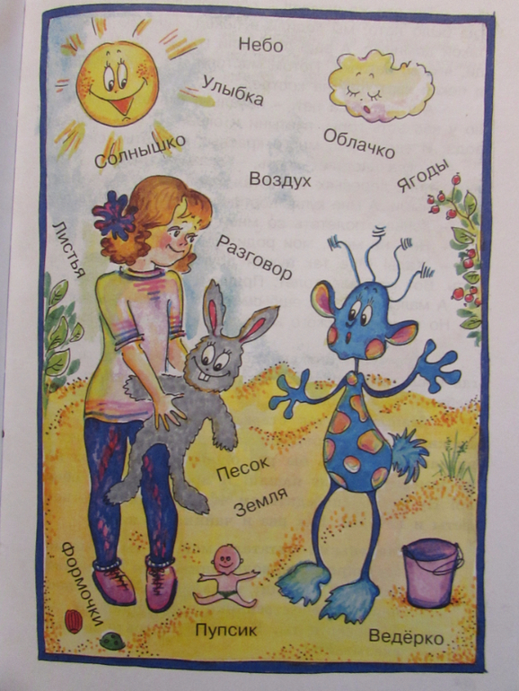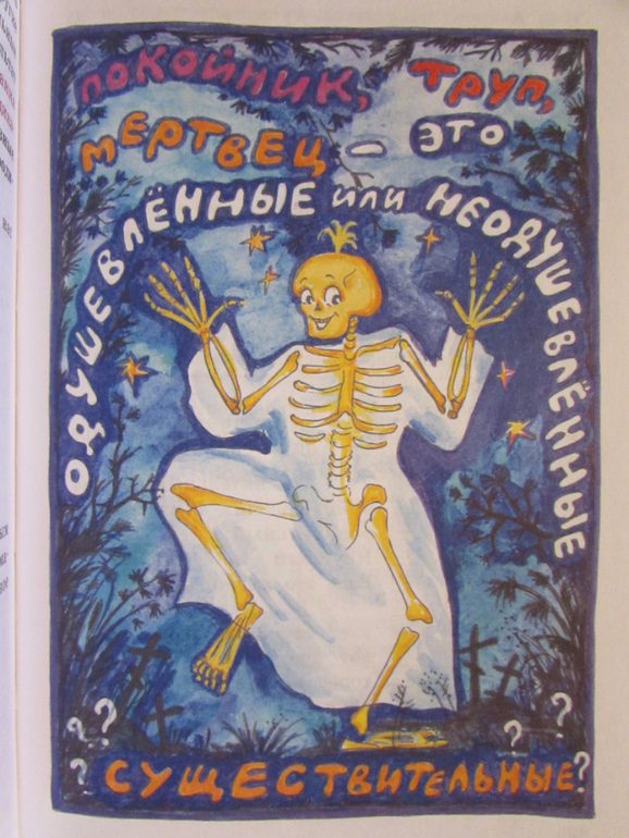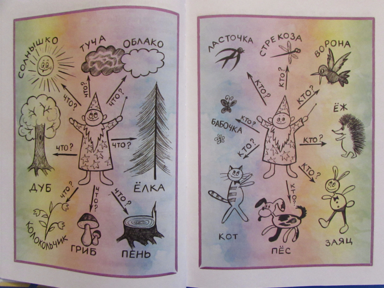 Итак, это книжка про старенького волшебника, его зовут Имя Существительное. Он может превращаться в разные ПРЕДМЕТЫ: в коня, в качели, в мяч, в дом, в ворону, в динозавра и т.д.