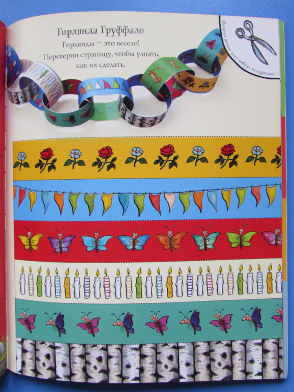Здесь и раскраски и разрисуйки, головоломки и поделки, кулинарные рецепты, игральные карты с Груффало, большой разворот для наклеек и много чего другого интересного детям.
