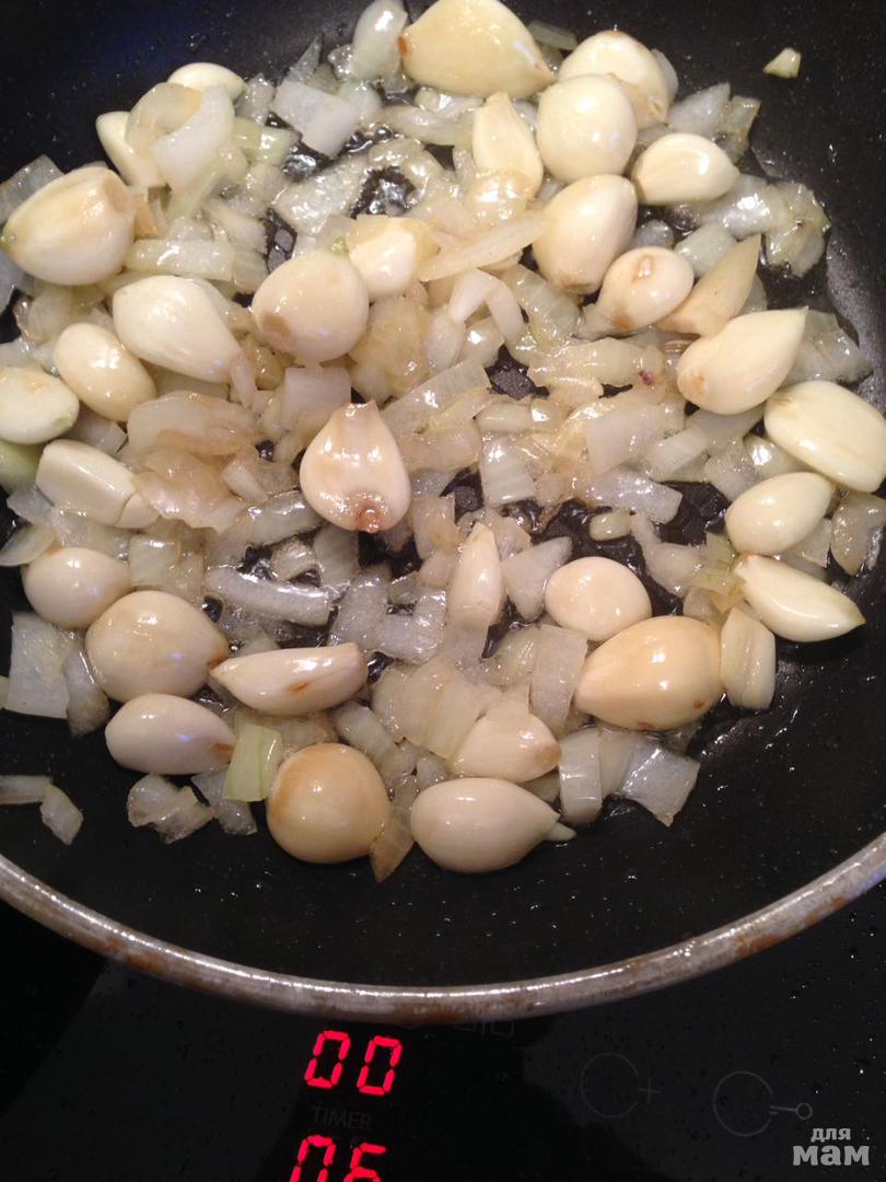 обжарить без обгорелостей // добавить 100 гр вина белого и 5 минут покипит пусть - спирт выйдет
