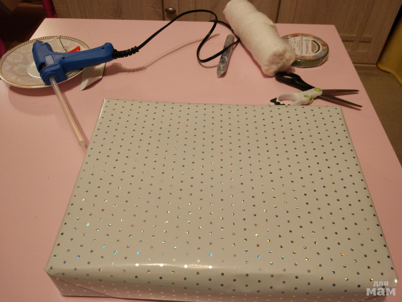 Такие вот 3 шарика разного размера получились. Далее берем основу (в моем случае - остатки пеноплекса со стройки) и декорируем. Мы взяли упаковочную бумагу.