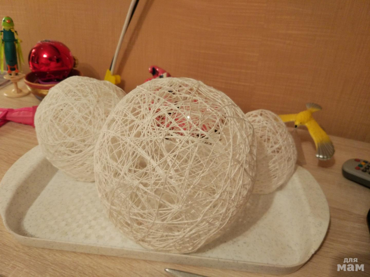 Итак, начнем. Задание на изготовление поделки было получено как всегда за 3 дня до срока. Ну что делать? Будем мотать.. Да-да, берем шарик и обматываем его нитками (я взяла с работы те, которыми прошивают документы), а затем обильно смазываем готовые обмотки клеем ПВА и оставляем сохнуть на батарее на пакете (от газеты может окраситься).