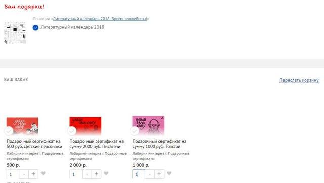 книги и подарочные сертификаты. Литературный календарь дают за сумму заказа (сумма — это с учётом скидок):