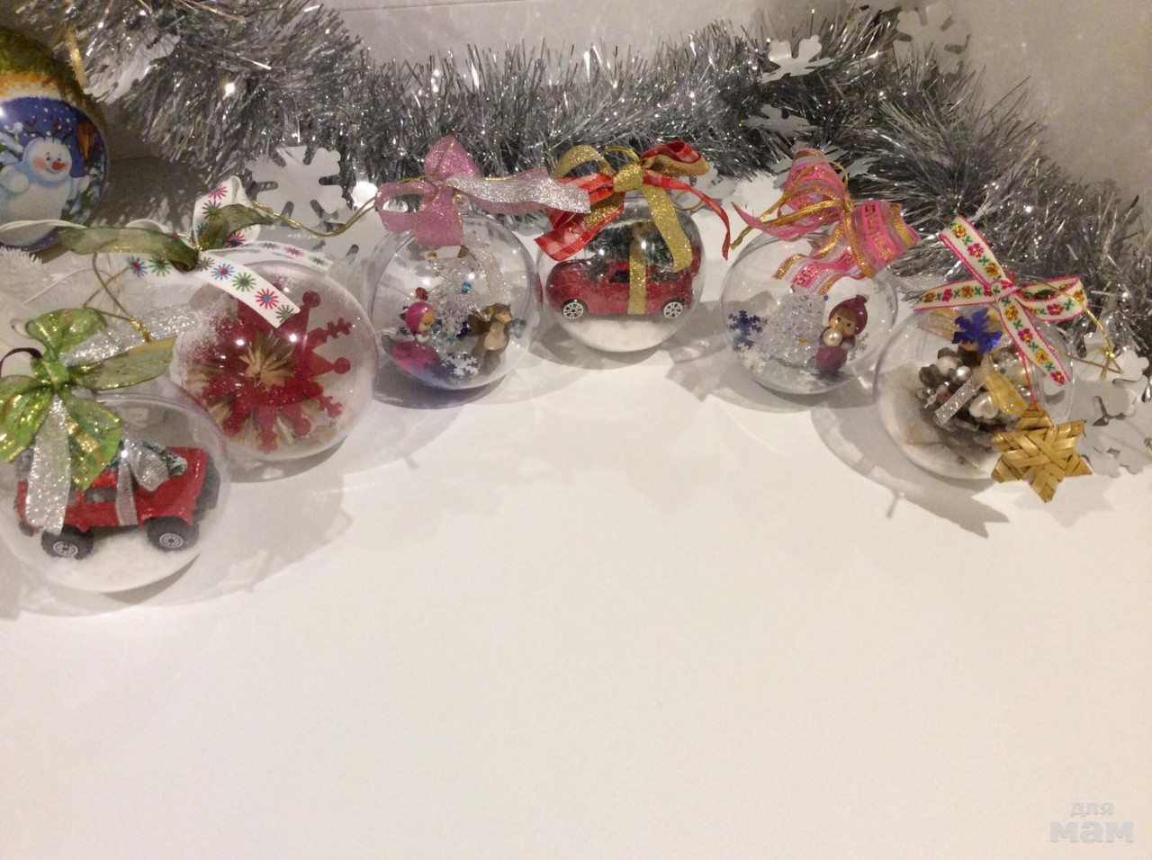 У нас в ход пошли сувениры и игрушки из того же ФиксПрайса (магазин, где ничего не советую покупать для прямого назначения-пользования, но который считаю Клондайком для Переделкиных)))) Бусины, пуговки, фигурки из шоколадных шаров, даже настоящие шишки - покрасила лаком для ногтей, наклеила бусинки и впихнула в шар))