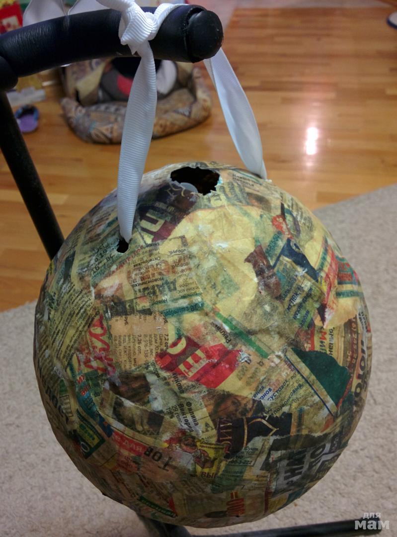 Затеяли как-то папа с дочкой сделать осеннюю поделку - шар папье-маше. И сделали. Но сделали с опозданием, к зиме. Так осенняя поделка перешла в зимнюю - новогодний шар.