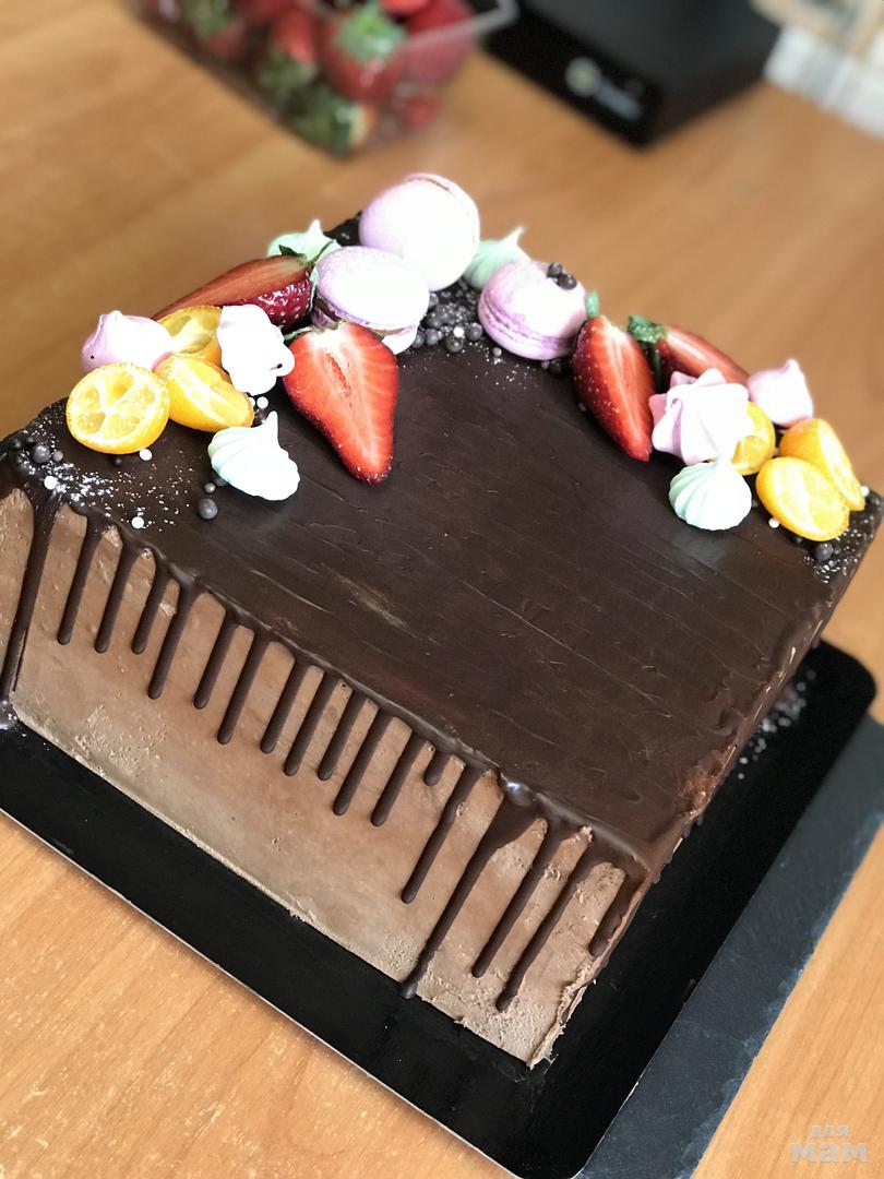 Шоколадный бисквит с шоколадным кремом пломбир и домашним мармеладом малина-личи, шоколадный ганаш на кокосовом масле.