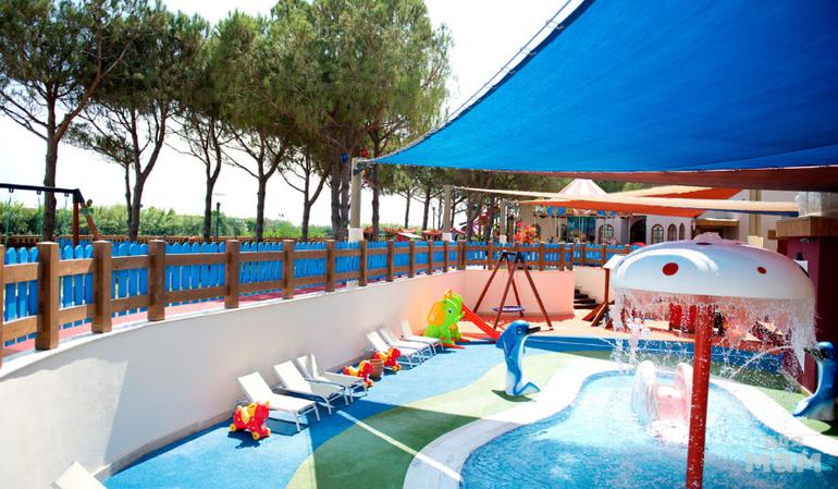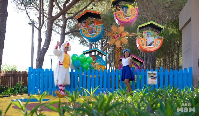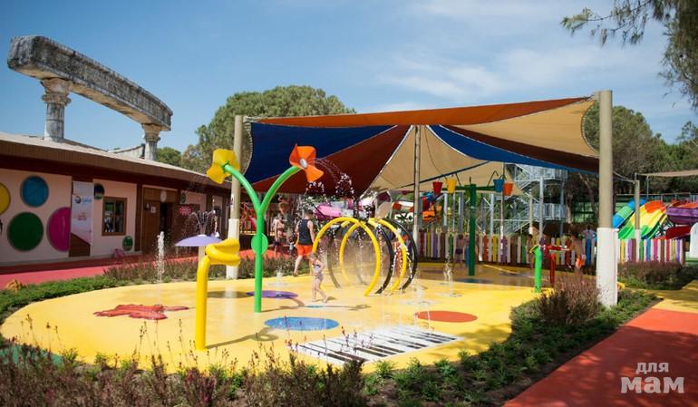 Прямо напротив Ресепшен детей ждут луна-парк с каруселью, мини-колесом обозрения, поездом и батутом, а также отдельный парк с водными развлечениями в форме сенсорных фонтанов.