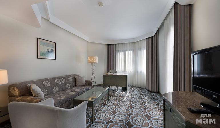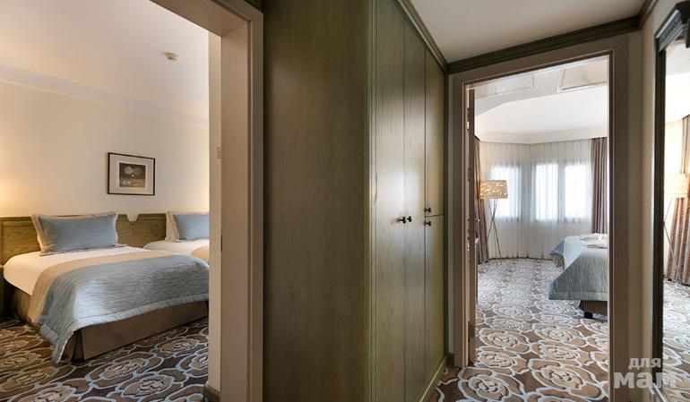 3 presidential suites (2 номера площадью 164 m2, 1 номер площадью 214 m2, гостиная с отдельной столовой зоной, кухня с плитой и холодильником, 2 / 3 спальни, рабочий кабинет, межкомнатные двери, 2 / 3 ванные комнаты, джакузи, 3 санузла, DVD-плеер, бар, доставка фруктов, личный официант (по запросу), бесплатные услуги прачечной, терраса, sea view, макс. 6 чел.) - 4 этаж main building