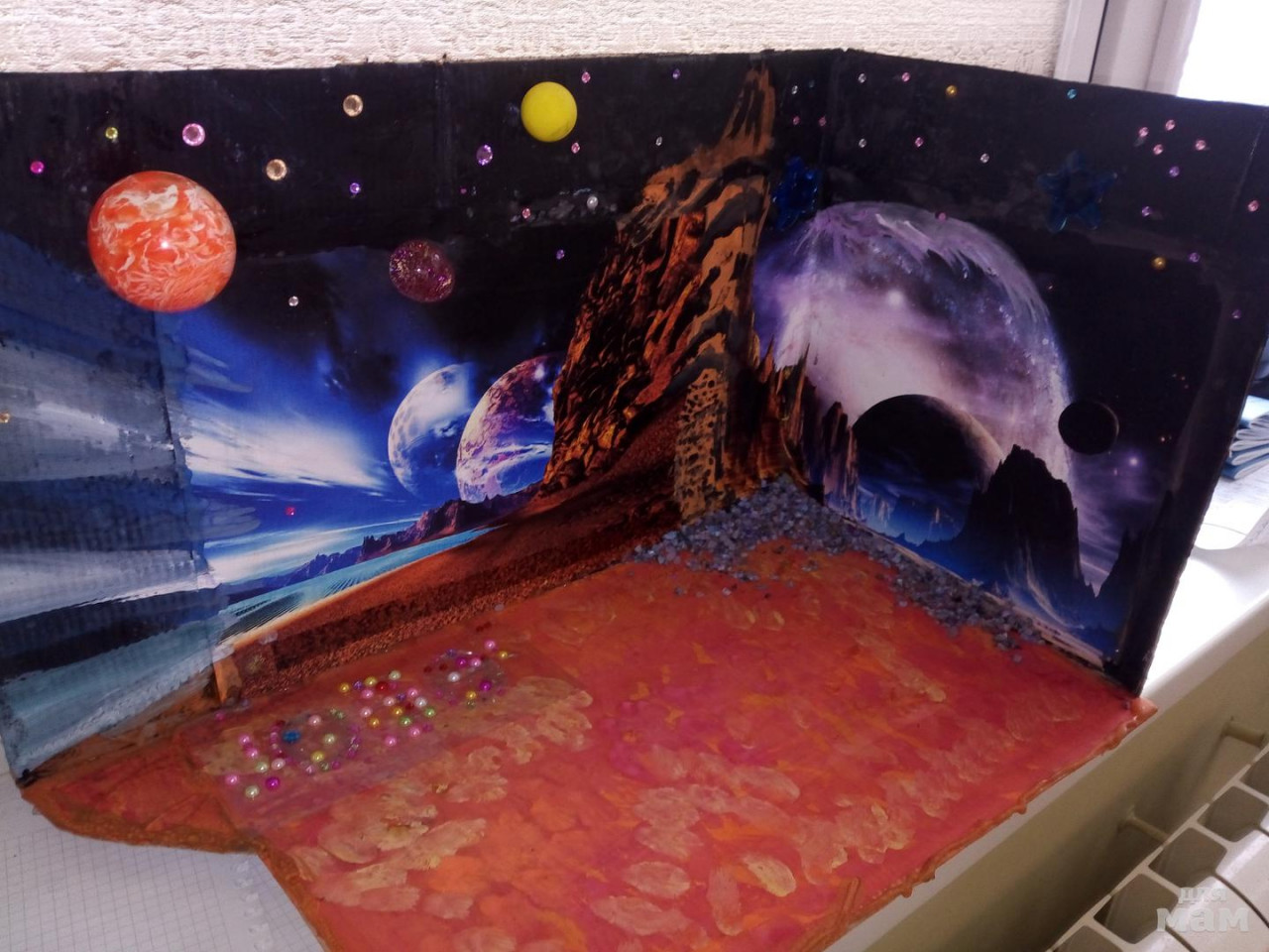 Нашла в инете 2 похожие картинки, распечатала и приклеела. Где не хватило- фон подрисовала. Мячики -попрыгунчики выступили в виде планет(на саморезах). Блестяшки из Фикс прайса-звезды.