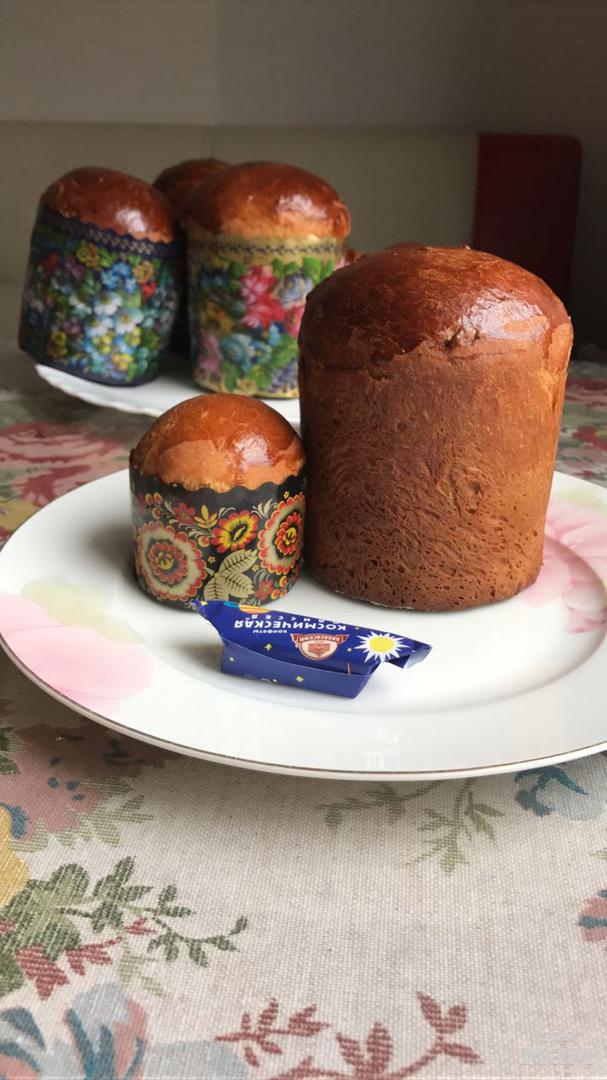 Смазываем пасхи сверху яичным желтком, размешенным с ложкой теплой воды, перед тем как поставить их в духовку . Проверяем готовность пасхи деревянной палочкой. Время зависит от размера куличика. Температура 160 градусов