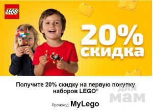 Промокод MyLego дает скидку 20% на ПЕРВУЮ покупку наборов Lego