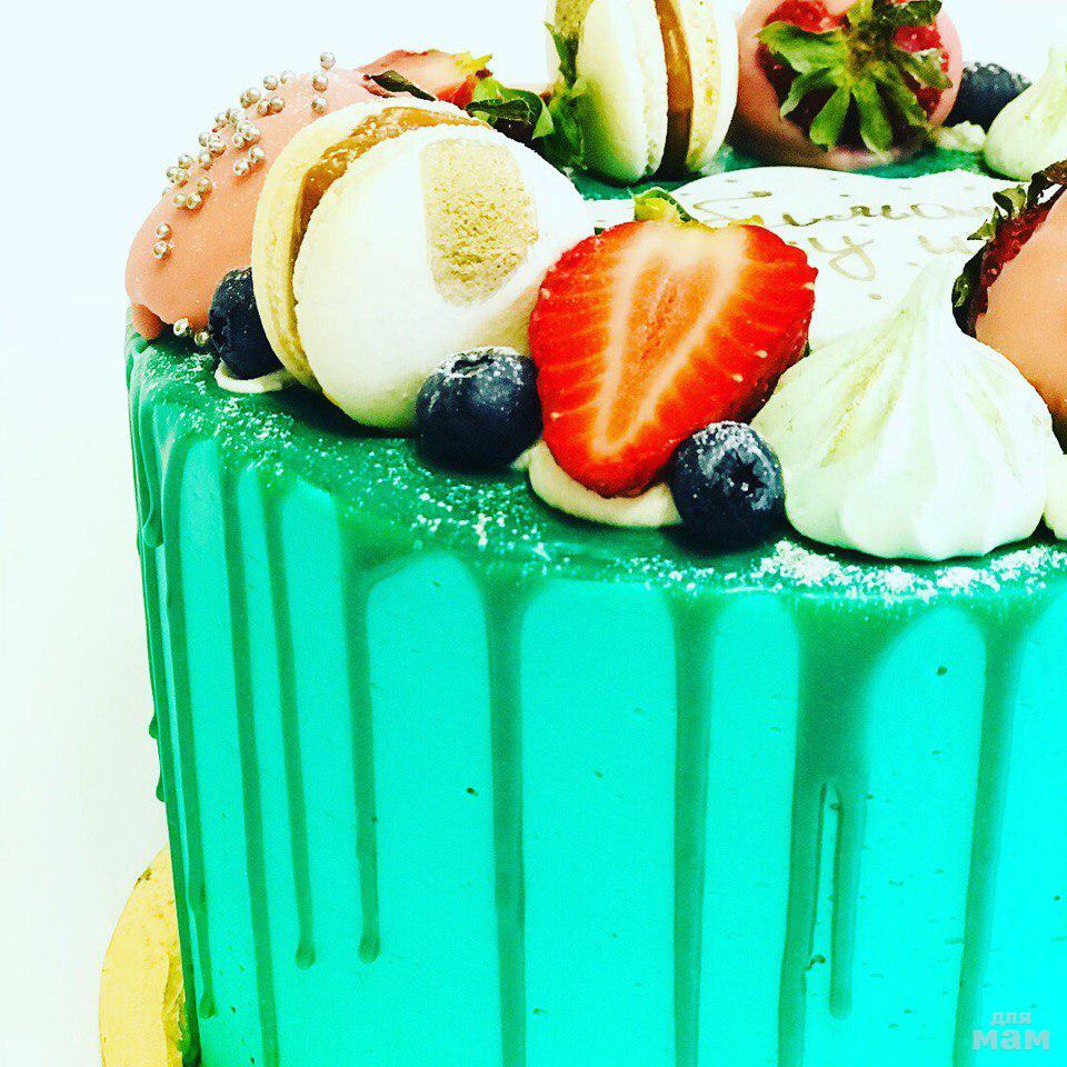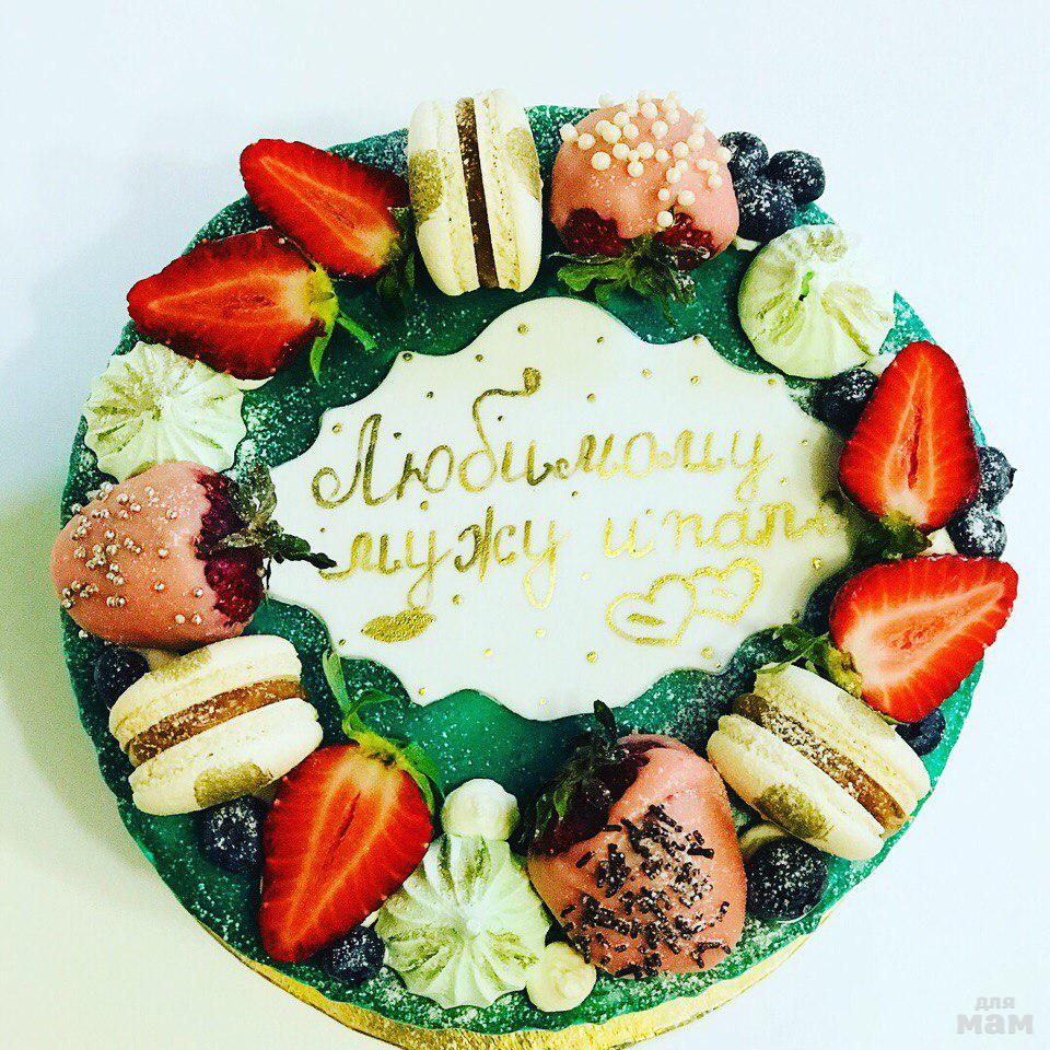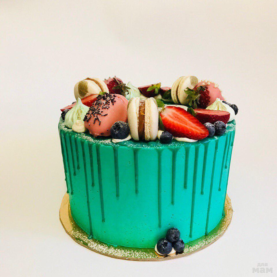 Шоколадный бисквит пропитаний клубничным сиропом, сливочный крем с маскарпоне, свежая клубника.Декор макарон с солёной карамелью, клубника в клубничном шоколаде Каллебаут .Вес 3 кг