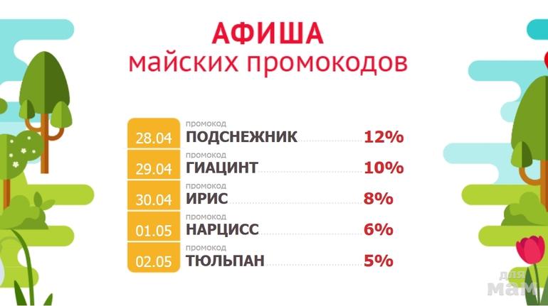 МАЙ-ШОПАфиша майских промокодов!28.04. — ПОДСНЕЖНИК -12%29.04. — ГИАЦИНТ — 10%30.04. — ИРИС — 8%01.05. — НАРЦИСС — 6%02.05. — ТЮЛЬПАН — 5%Скидка суммируется с накопительной но не более 25%