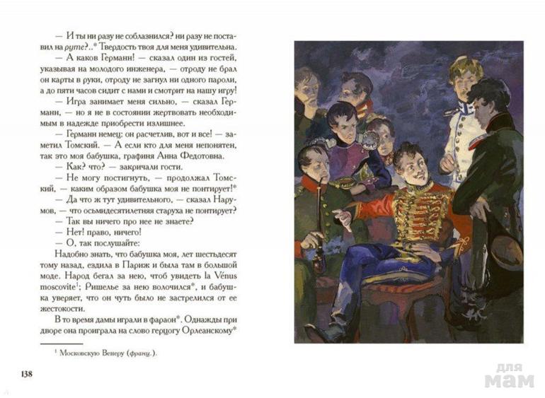 Книга сопровождается иллюстрациями двух художников середины прошлого века. Арам Ванециан изображает "Повести Белкина" яркими, красочными, позволяя читателю детально представить себе героев. Андрей Николаев в своих иллюстрациях сосредотачивается на фатуме, власть которого очевидна в портретах Германа, Лизы и старой графини.