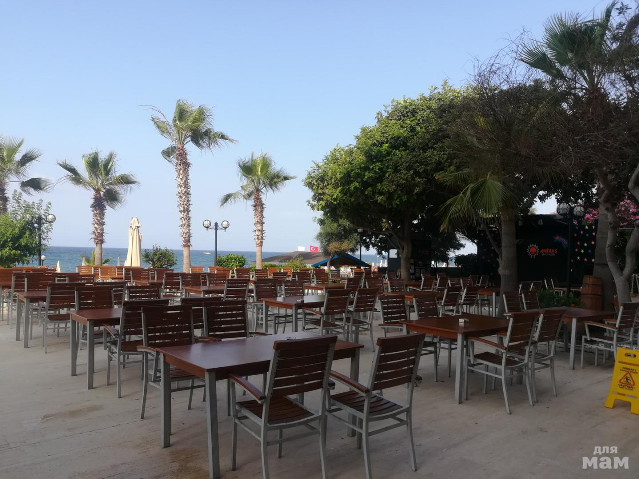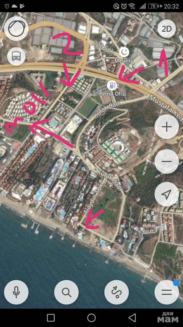 13) и напоследок - геолокация. Это важно, не люблю, когда из отеля некуда выйти. Пусть вас не угнетает пустырь напротив входа в отель (зато тихо!) - с развлечениями в округе все отлично. Прикрепляю скриншот Яндекс.карт, там стрелочкой отмечен отель (сразу видно, что он прямо у моря), под стрелкой 1 та самая заправка, где надо просить остановить водителя автобуса, там же Мигрос джет, где можно купить подгузники, каши всякие, влажные салфетки и все такое прочее. Под стрелкой 2 муниципальный парк, там очень красиво вечером, все подсвечено. Абсолютно безопасно, мы туда вечером с сыном и вдвоем ходили. Если пойти по Kulak cad. влево (не в сторону трассы, а именно влево вдоль вилл), то вы дойдете до молла. В общем, не соскучитесь.